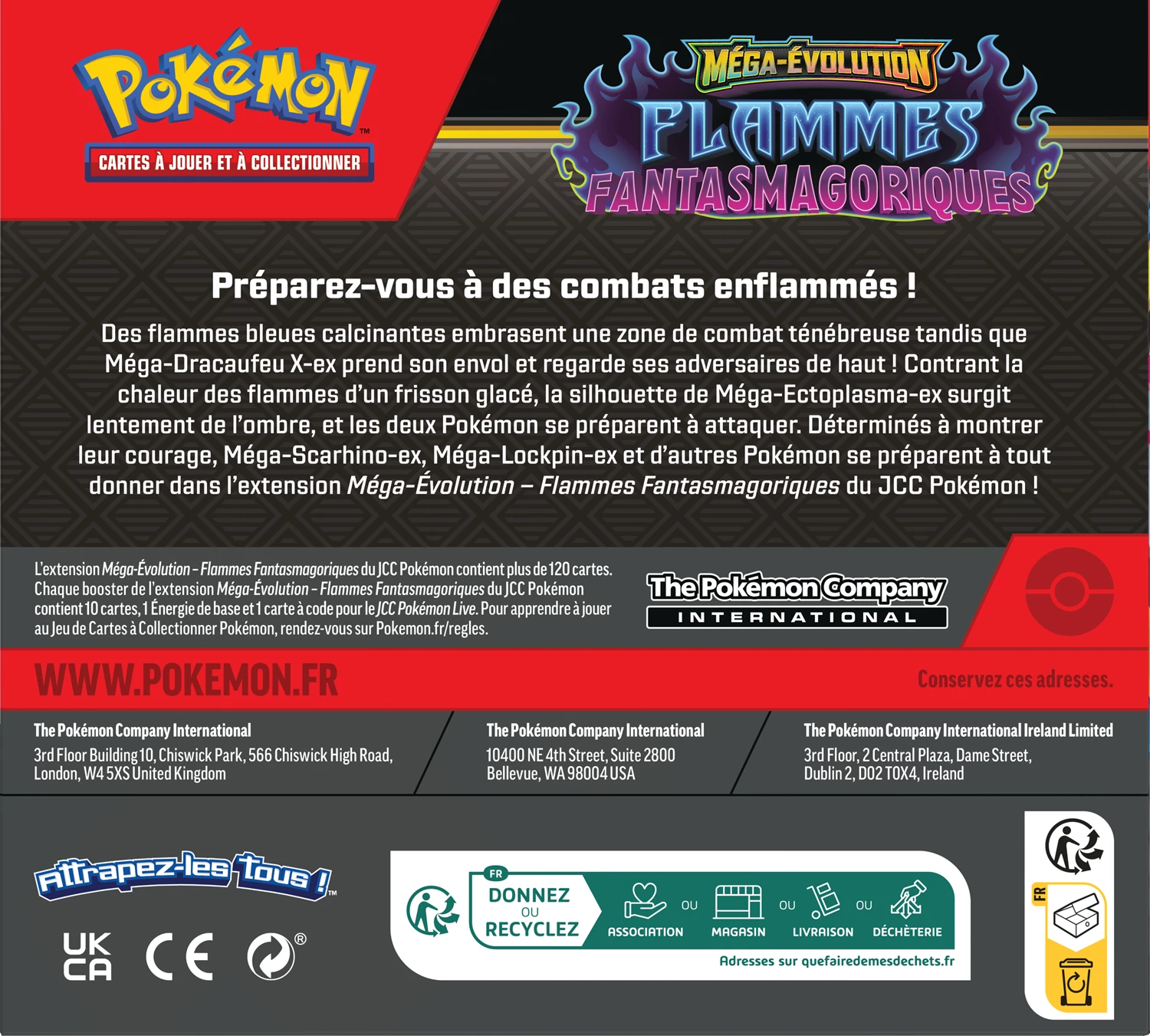Des flammes bleues calcinantes embrasent une zone de combat ténébreuse tandis que Méga-Dracaufeu X-ex prend son envol et regarde ses adversaires de haut ! Contrant la chaleur des flammes d'un frisson glacé, la silhouette de Méga-Ectoplasma-ex surgit lentement de l'ombre, et les deux Pokémon se préparent à attaquer. Déterminés à montrer leur courage, Méga-Scarhino-ex, Méga-Lockpin-ex et d'autres Pokémon se préparent à tout donner dans l'extension Méga-Évolution - Flammes Fantasmagoriques du JCC Pokémon !